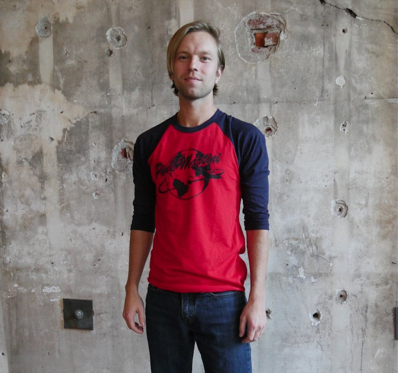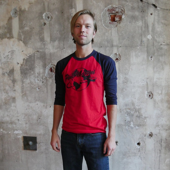 Perfect for the cooler weather, it's our 3/4 length sleeve retro baseball tee. Red and dark navy blue with our Around the World With Pink Martini logo! Printed on super soft, 50/50 blend sweatshop-free American Apparel tees.