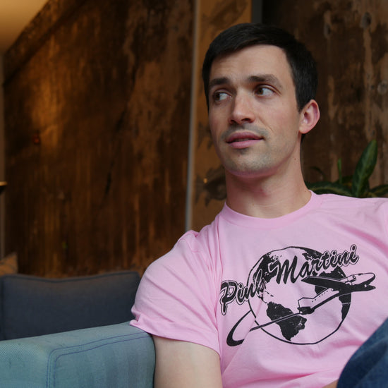 Sit back and relax with the Around The World With Pink Martini Tee! Printed on pink, 50% cotton 50% polyester blend, sweatshop-free American Apparel tees.