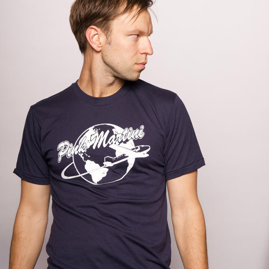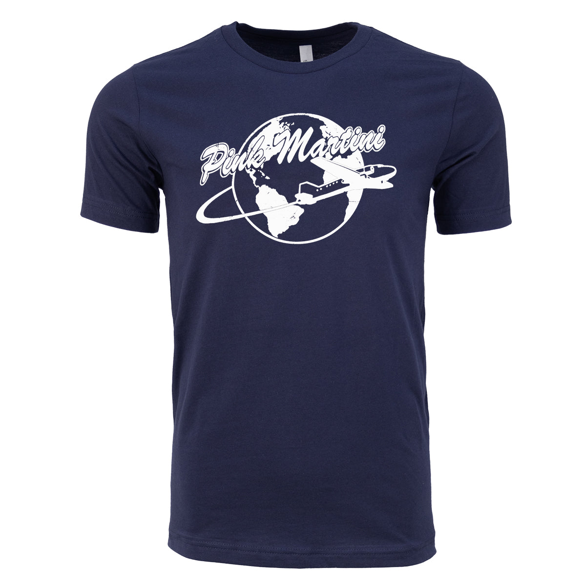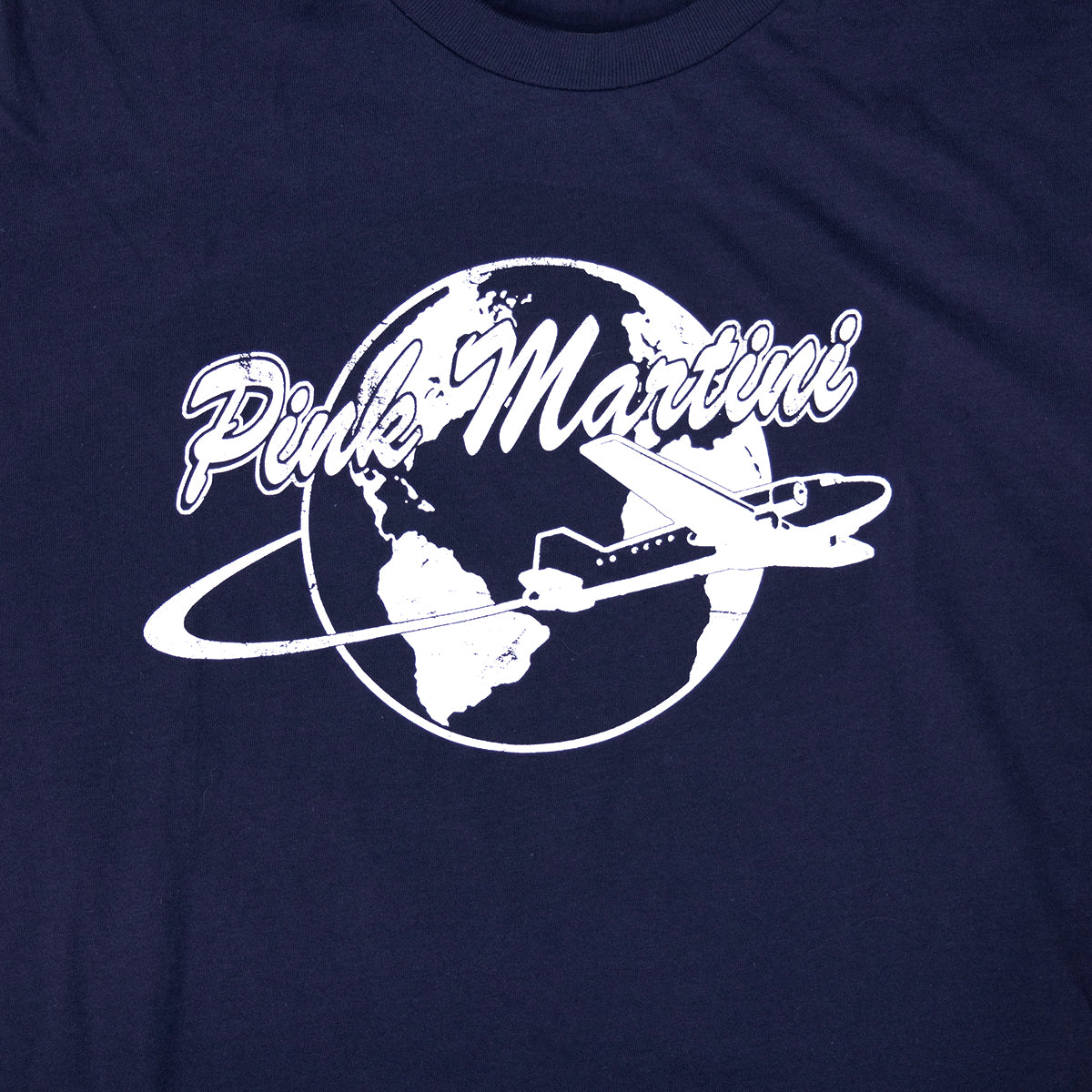 Sit back and relax with the Around The World With Pink Martini Tee! Printed on navy blue, 50% cotton 50% polyester blend, sweatshop-free American Apparel tees.