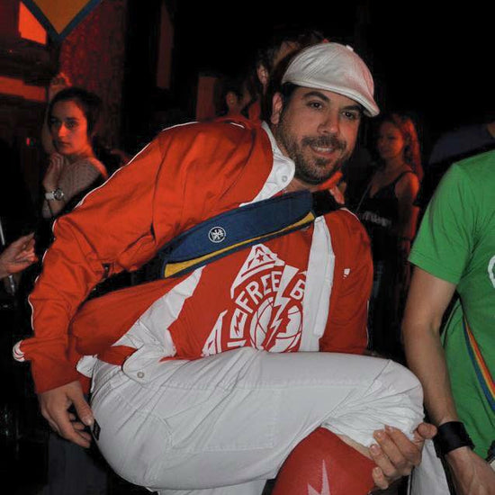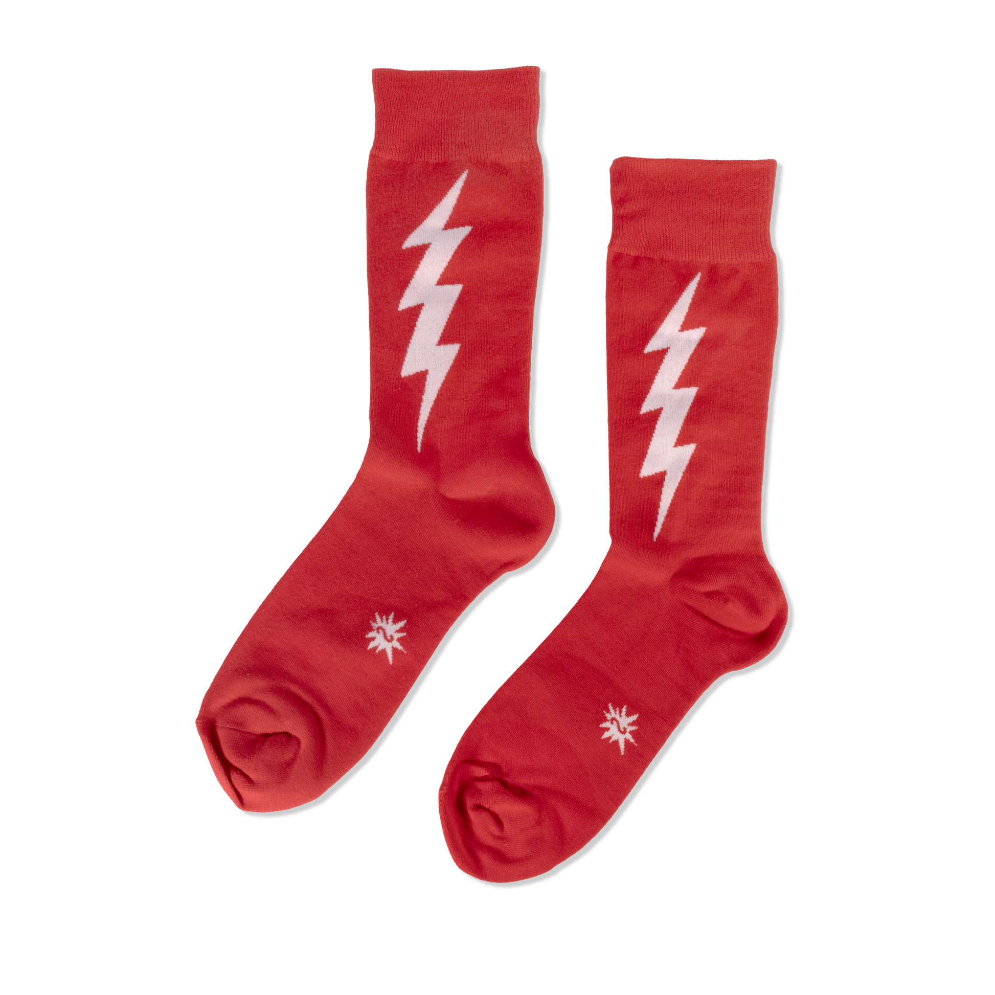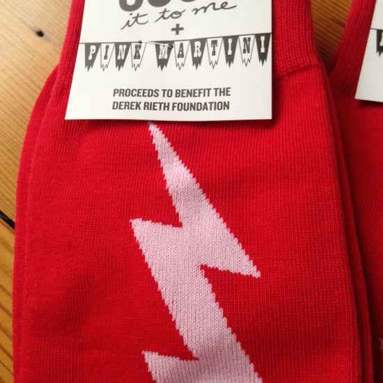 Pink Martini is honored to present these thunderbolt socks in collaboration with Sock it to Me, in memory of our percussionist Derek Rieth. Derek could frequently be seen wearing these socks representing Xango the patron of music, dance, drumming, thunder and lightning in the Brazilian Candomblé religion.