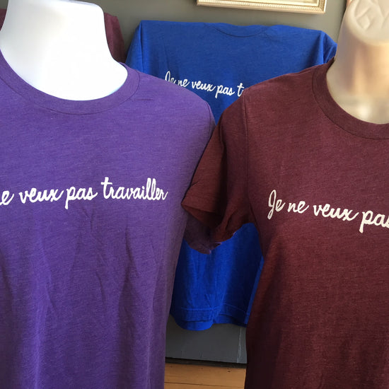 In celebration of the record that started it all comes the Je ne vex pas travailler tee from the title track of Sympathique. "Je ne veux pas travailler" effectively translates to "I don't want to work" so this tee is a perfect pick for a Monday back at the office after a too-short weekend!