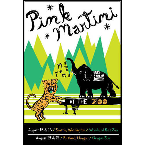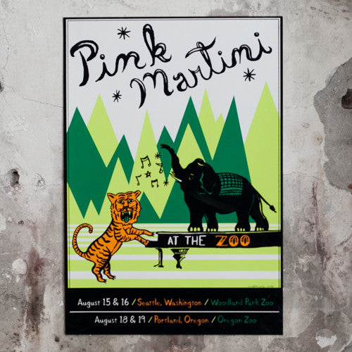 A unique, limited edition, hand printed, 17 x 22" silk-screen poster created by graphic designer Justin "Scrappers" Morrison. The poster was printed to commemorate Pink Martini's Summer 2012 concerts in Seattle, WA & Portland, OR.